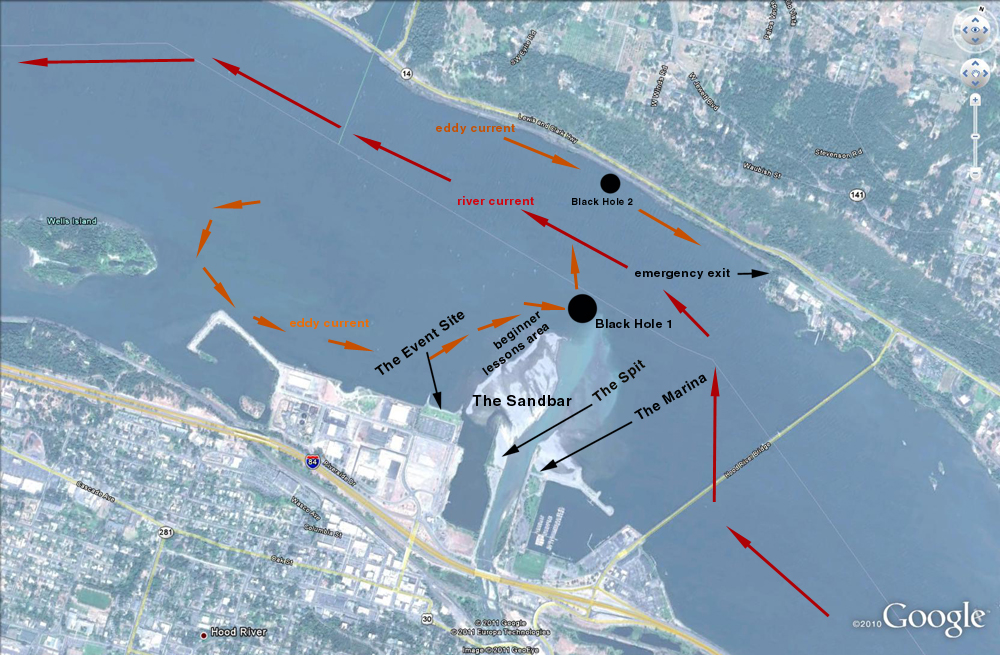 - There are strong currents in the area where the Columbia and Hood Rivers converge (Black Hole 1). It is especially easy to get stuck down here and not able to get back upwind because of the currents. If you get stuck, make sure you know how to self rescue properly, and don't be afraid to end up on the Washington side if you need to.